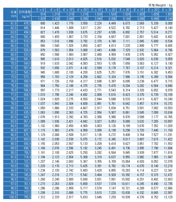 61T부터 100T 철판의 단위중량과 사이즈별 중량은 아래 중량규격표를 참고하세요.