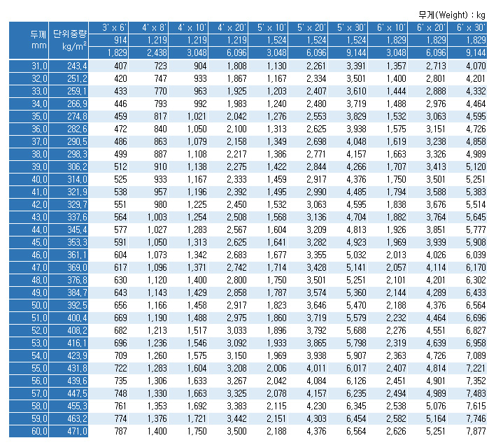 이번에는 31T 철판부터 60T까지 단위중량과 사이즈별 중량입니다.