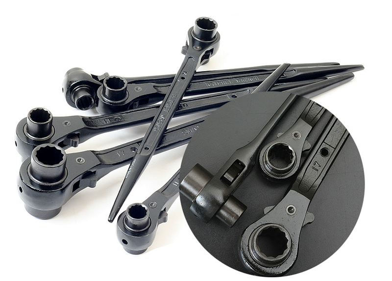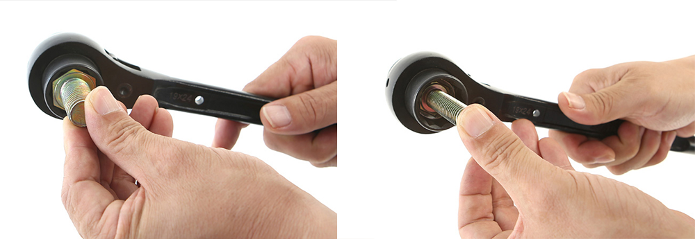 가장 일반적인 형태의 라쳇렌치로, 사이즈가 다른 소켓이 양쪽에 있습니다. 한쪽만 사용할 수 있는 것을 단구 라쳇렌치라고 하는데, 양구 렌치가 작업효율성이 좋기 때문에 더 많이 사용됩니다.