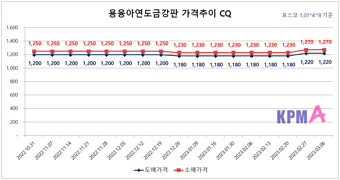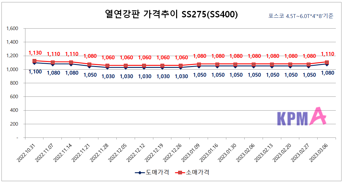 후판은 2022년 11월부터 쭉 안정된 모습을 보여왔는데, 2023년 3월 1주차부터 가격이 올랐습니다. 전월 대비 kg당 50원 인상되어 소매가격 기준 1,240원에 판매되고 있습니다.