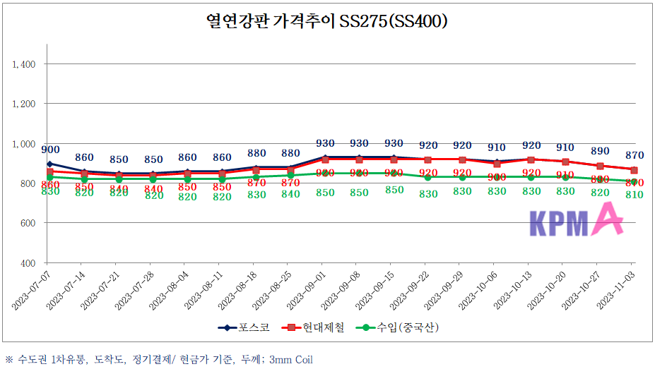 지금부터 소개해드리는 철판가격은 수도권 1차유통가 기준입니다. 회사소재지가 수도권이 아닌 지방에 위치한 경우 실제 구입가능한 가격과 차이가 발생될 수 있으며, 거래조건 등에 따라서도 다를 수 있습니다. 따라서 전반적인 철판가격의 변동 흐름에 대해서만 참고하시기 바랍니다.