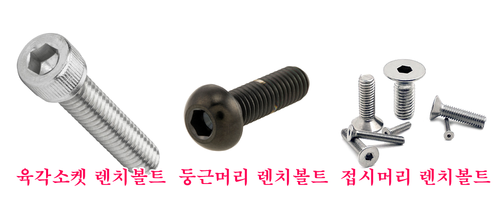 육각 볼트를 조일때 가장 많이 사용되는 것이 스패너입니다. 그런데 스패너는 사용할때 반경이 커지기때문에 기계의 좁은 틈이나 공간에서는 사용이 불가능할때가 있습니다. 이러한 문제점을 개선하고자 개발된 볼트가 있는데요. 바로 렌치볼트입니다. 아래 사진과 같이 볼트 머리가 육각이 아니라 볼트머리 안쪽 홈이 육각형태인 볼트를 육각 렌치볼트라고 부릅니다.